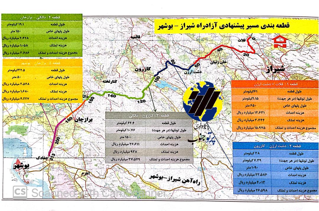 به گزارش پایگاه خبری پرتو جنوب، مسیر آزادراه و مشخصات کلی و برآورد هزینه های مربوطه که توسط معاونت ساخت و توسعه آزادراه های شرکت ساخت و توسعه زیربناهای حمل و نقل کشور تهیه شده، جهت اطلاع عموم منتشر شده و از نماینده شهرستان های کازرون و کوهچنار در مجلس شورای اسلامی درخواست می گردد به طور جد، پیگیر تصویب نهایی طرح فوق و تخصیص اعتبار و ردیف بودجه آن باشد و اجازه ندهد تغییر در مسیر این طرح، حق مردم این مناطق محروم را تضییع نماید.