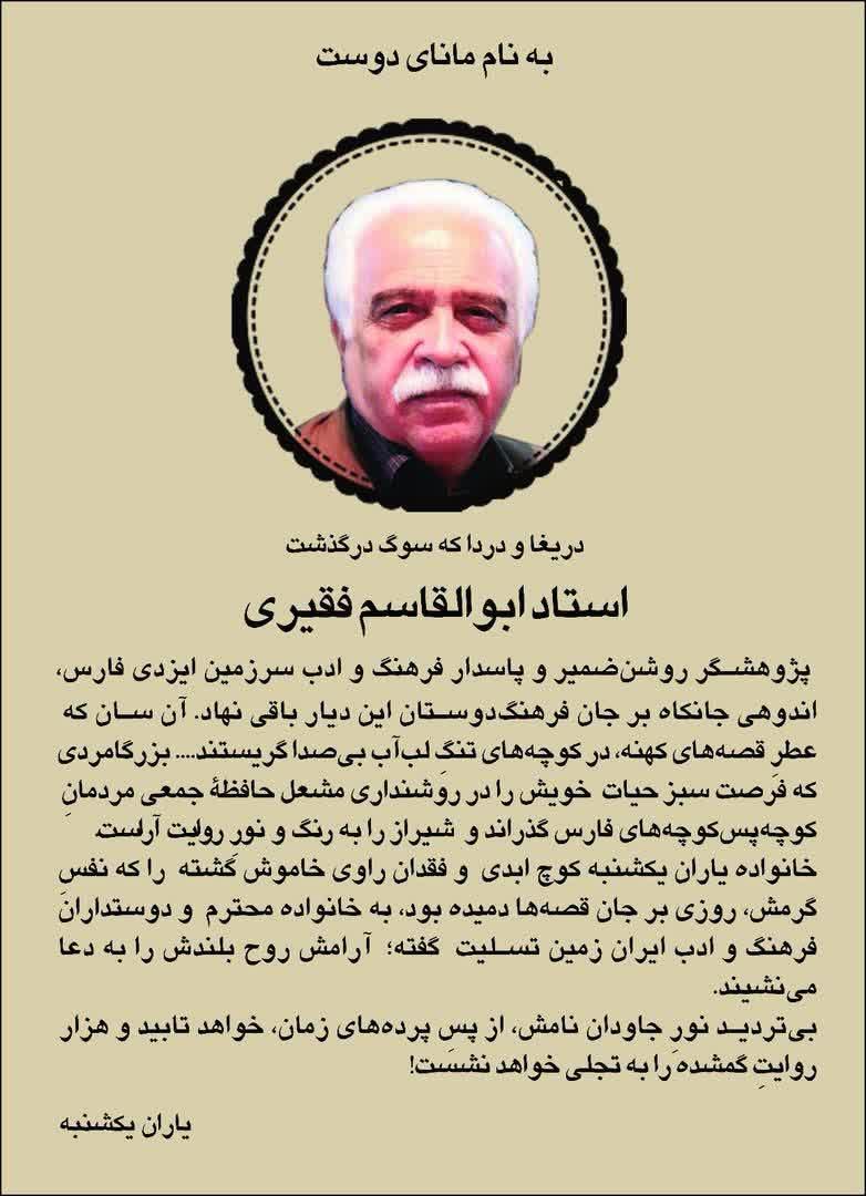 وداع با میراث زنده فرهنگ و ادب فارس/ابوالقاسم فقیری درگذشت