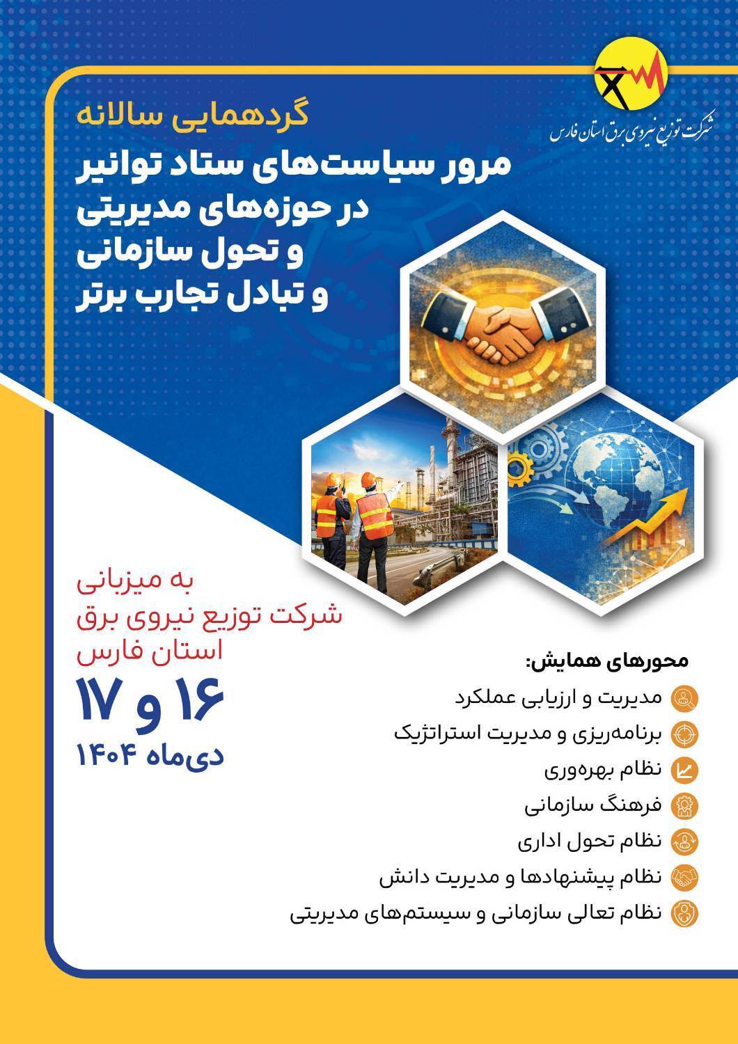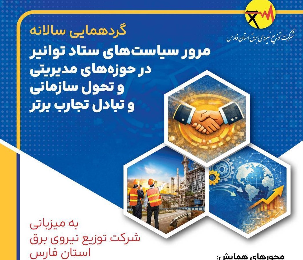 گردهمایی سالانه مرور سیاستهای ستاد توانیر در حوزههای مدیریتی و تحول سازمانی و تبادل تجارب برتر، به میزبانی شرکت توزیع نیروی برق استان فارس طی روزهای ۱۶ و ۱۷ دی ماه برگزار خواهد شد.